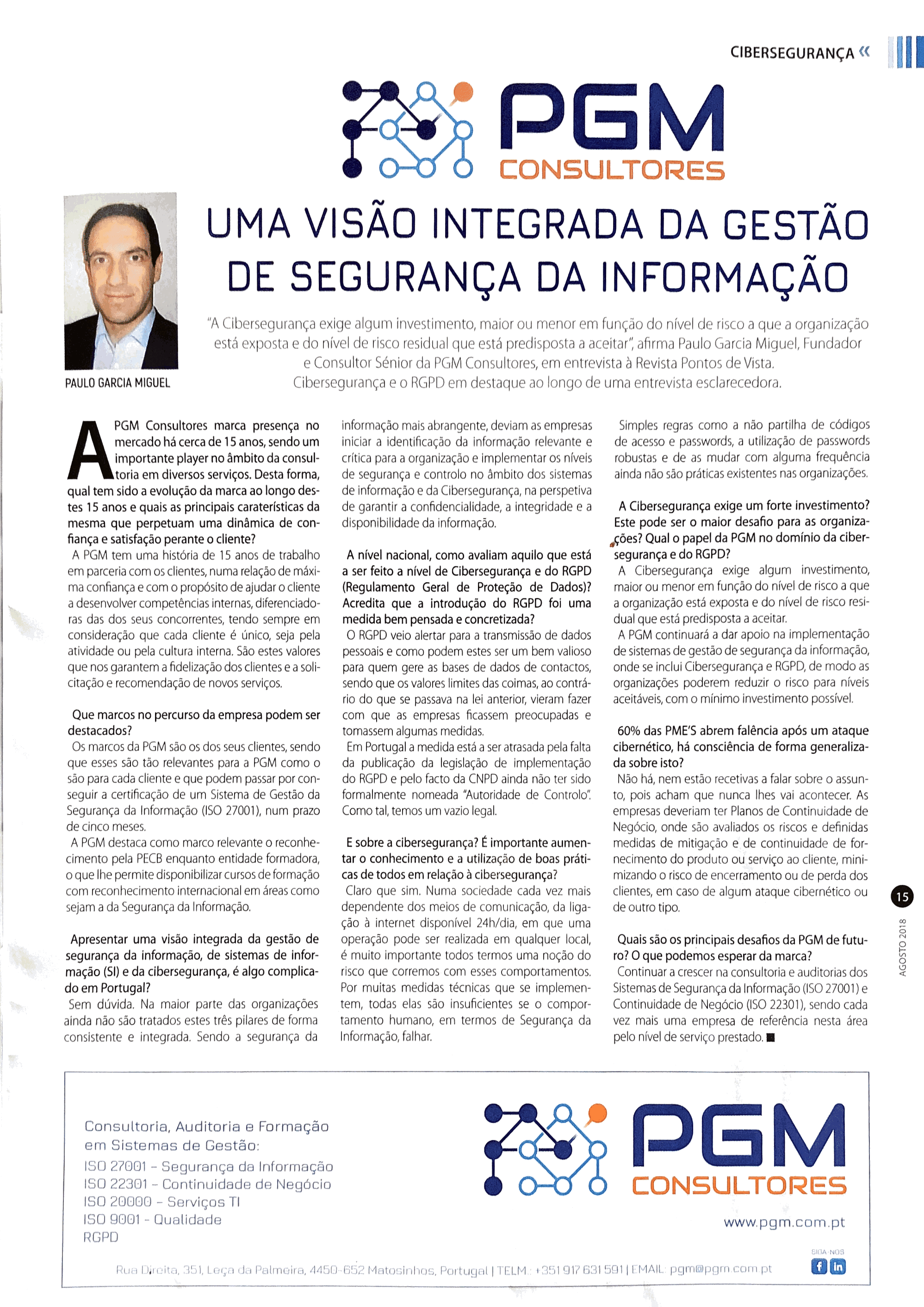 Hoje, dia 18 de Agosto de 2018, foi publicada uma entrevista do Fundador da PGM na revista "Pontos de Vista", suplemento do jornal "Público", sobre a segurança da informação e a cibersegurança.